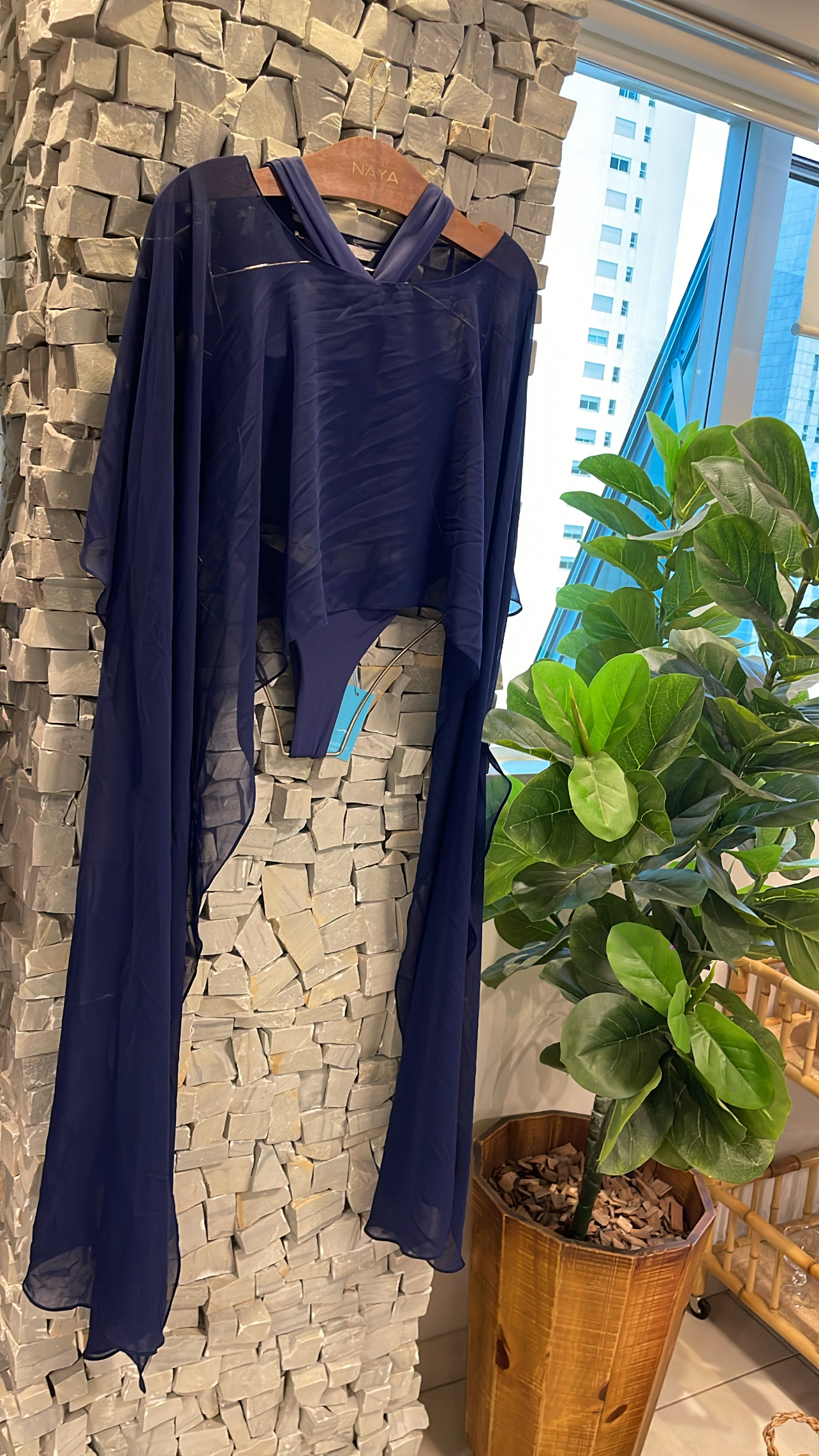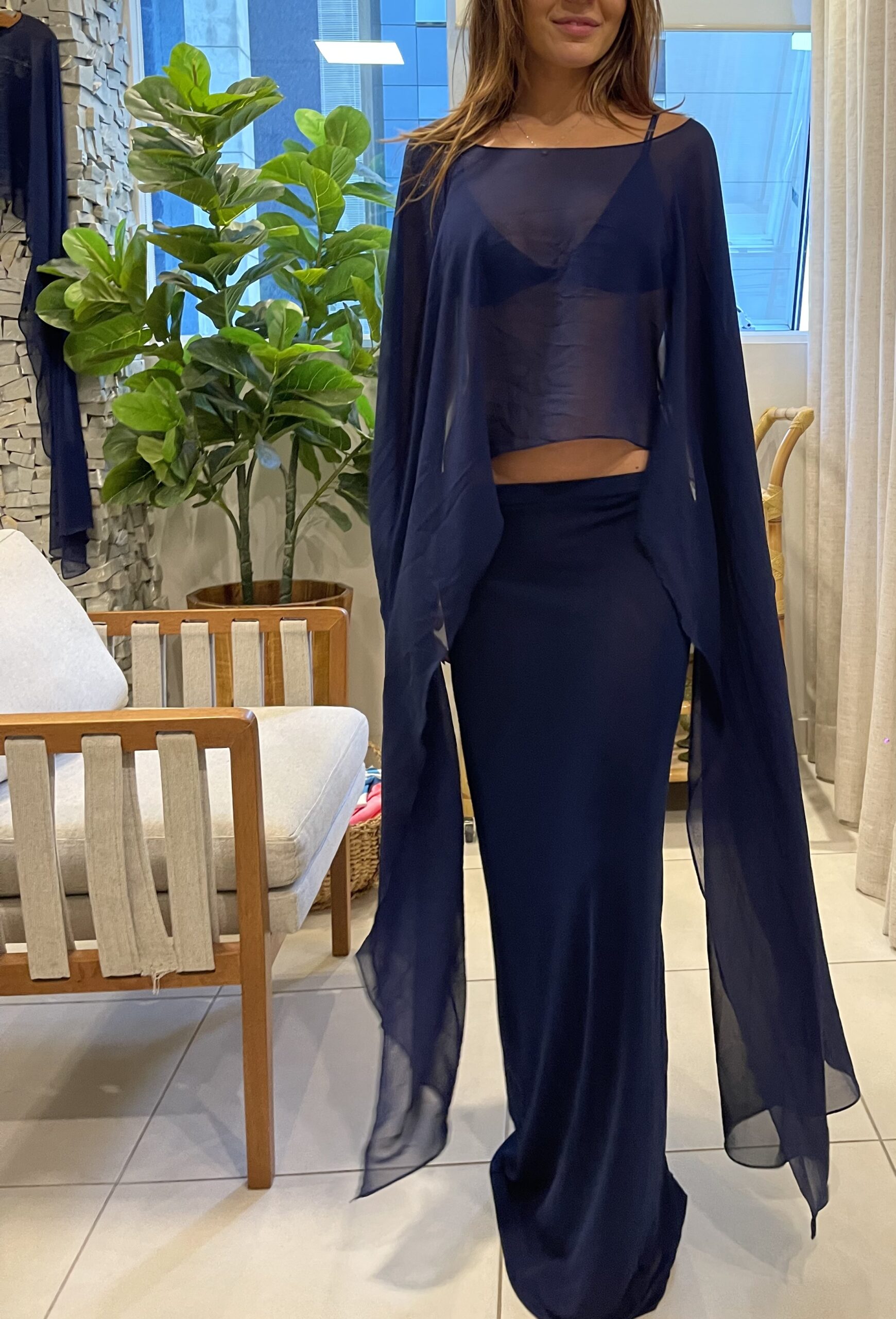 Capa confeccionada em musseline leve, com modelagem que traz fluidez e movimento. O comprimento assimétrico, mais curto na frente e alongado nas laterias ou atrás, cria um visual sofisticado e contemporâneo. Peça com transparência sutil, perfeita para compor produções elegantes à beira-mar ou em momentos de resort.