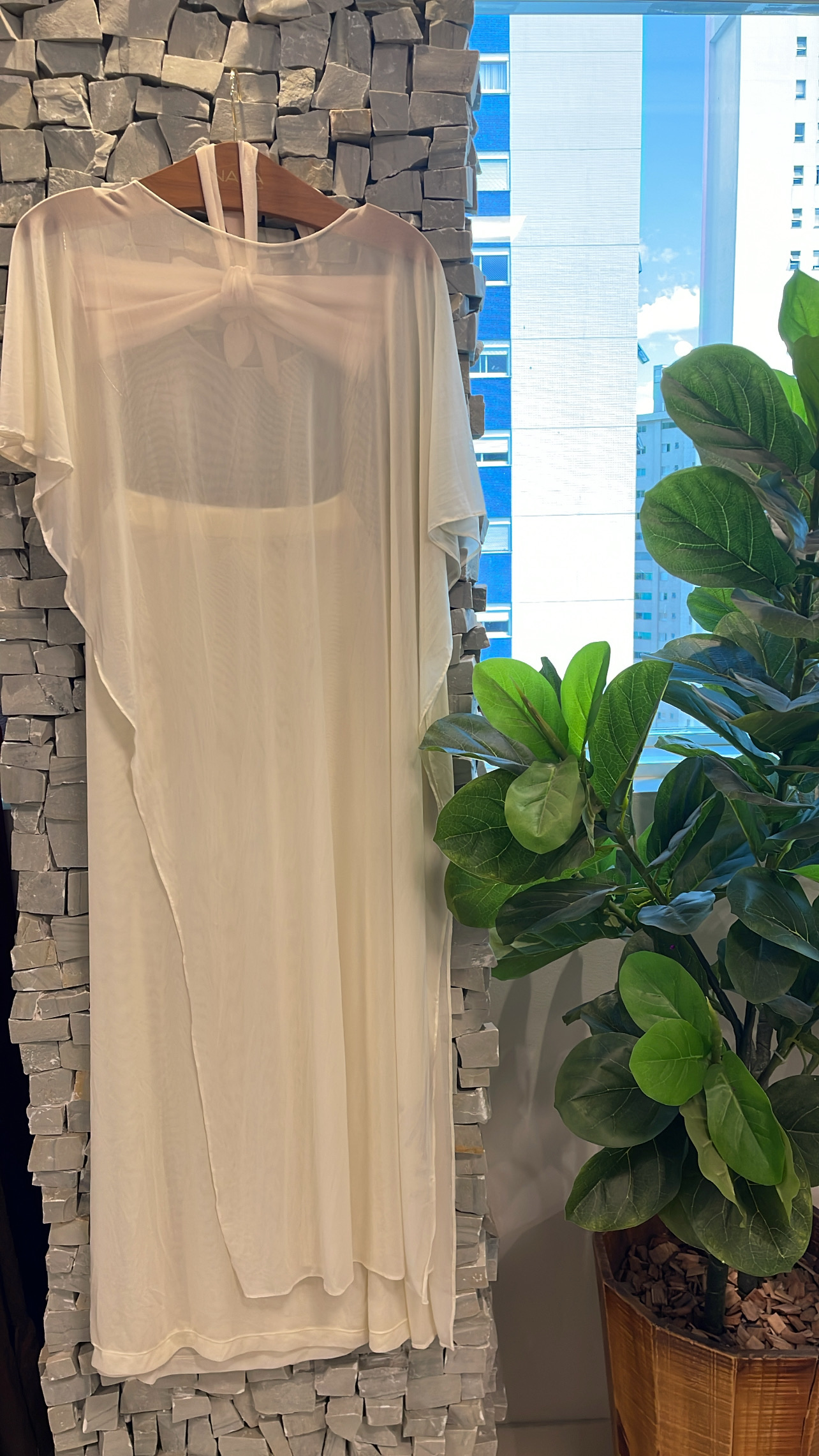 Capa confeccionada em tule com elastano e uma modelagem que traz fluidez e movimento. O comprimento assimétrico, mais curto na frente e alongado nas laterias ou atrás, cria um visual sofisticado e contemporâneo. Peça com transparência sutil, perfeita para compor produções elegantes à beira-mar ou em momentos de resort. É exatamente o mesmo tule da saia de tule off white, formando um conjunto incrível.
