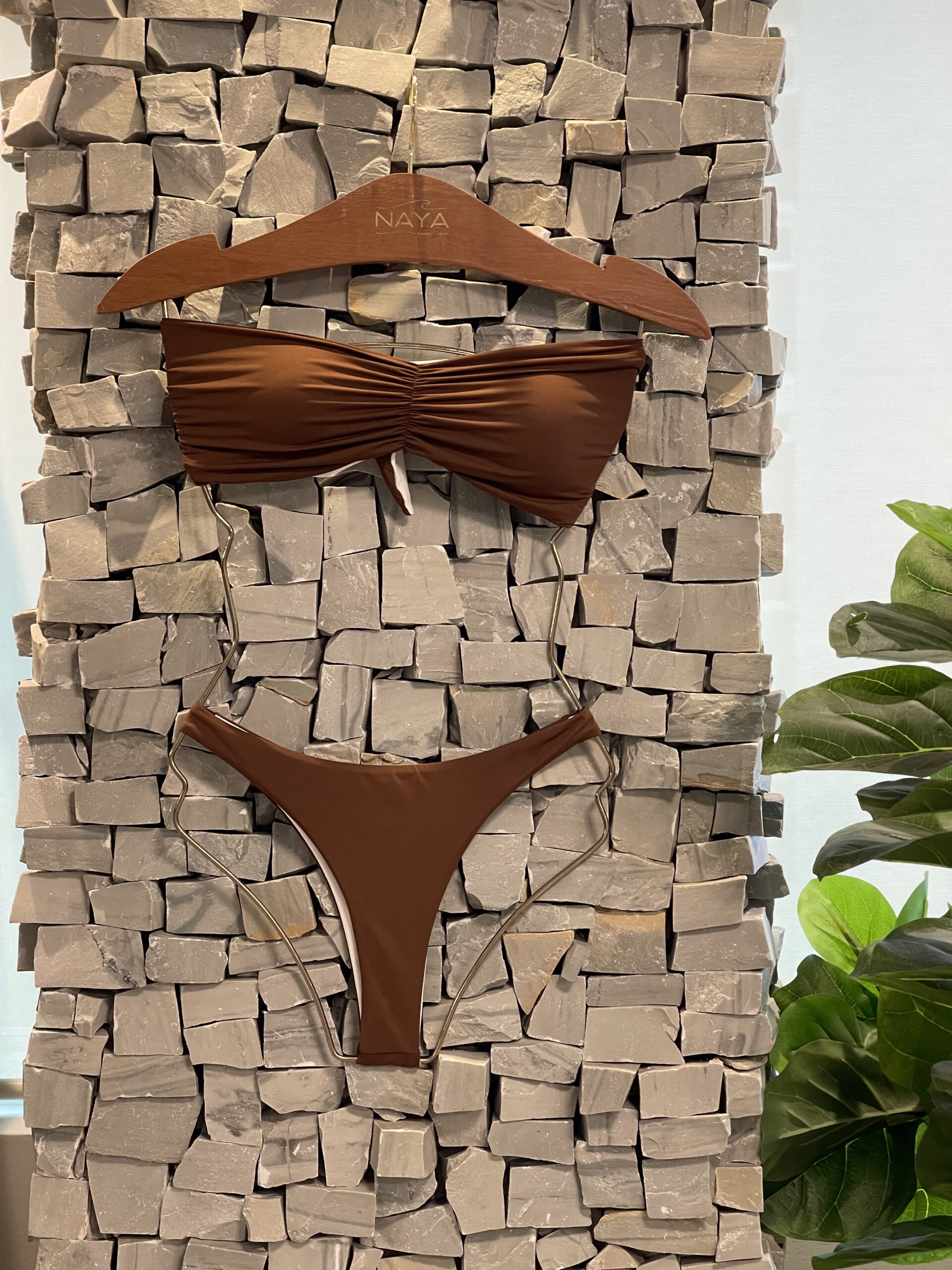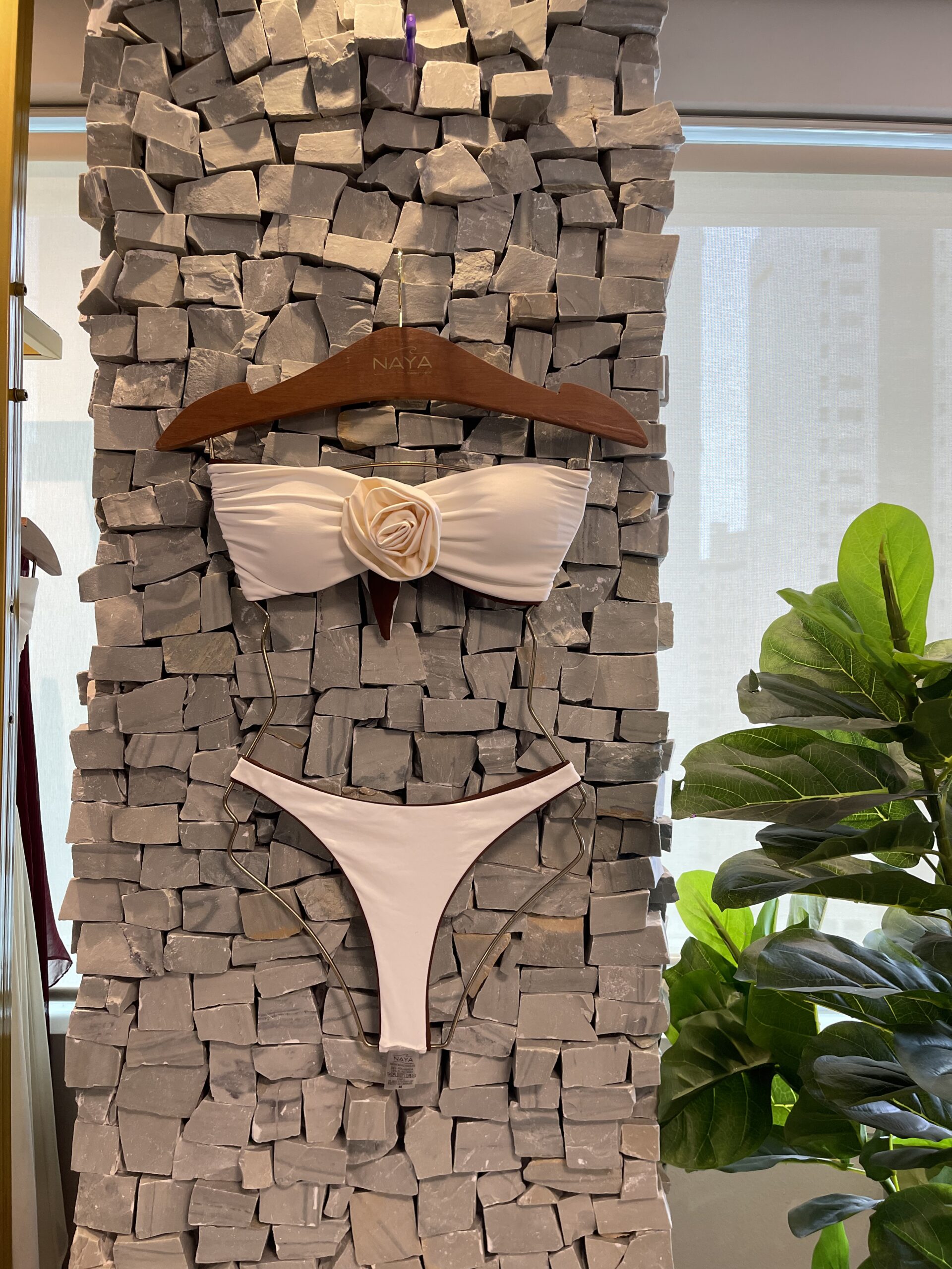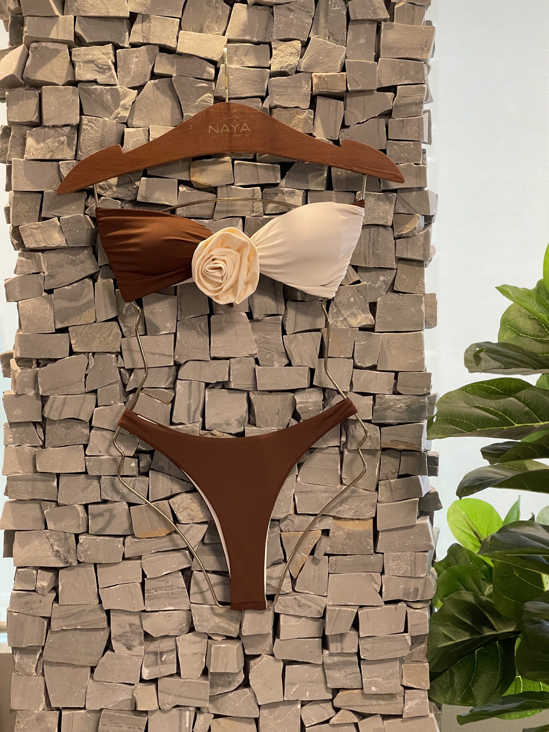 O biquíni acompanha a flor na cor off-white, delicada e atemporal. A flor marrom está disponível para compra separadamente, ampliando as possibilidades de composição e trazendo uma leitura mais quente e contemporânea.