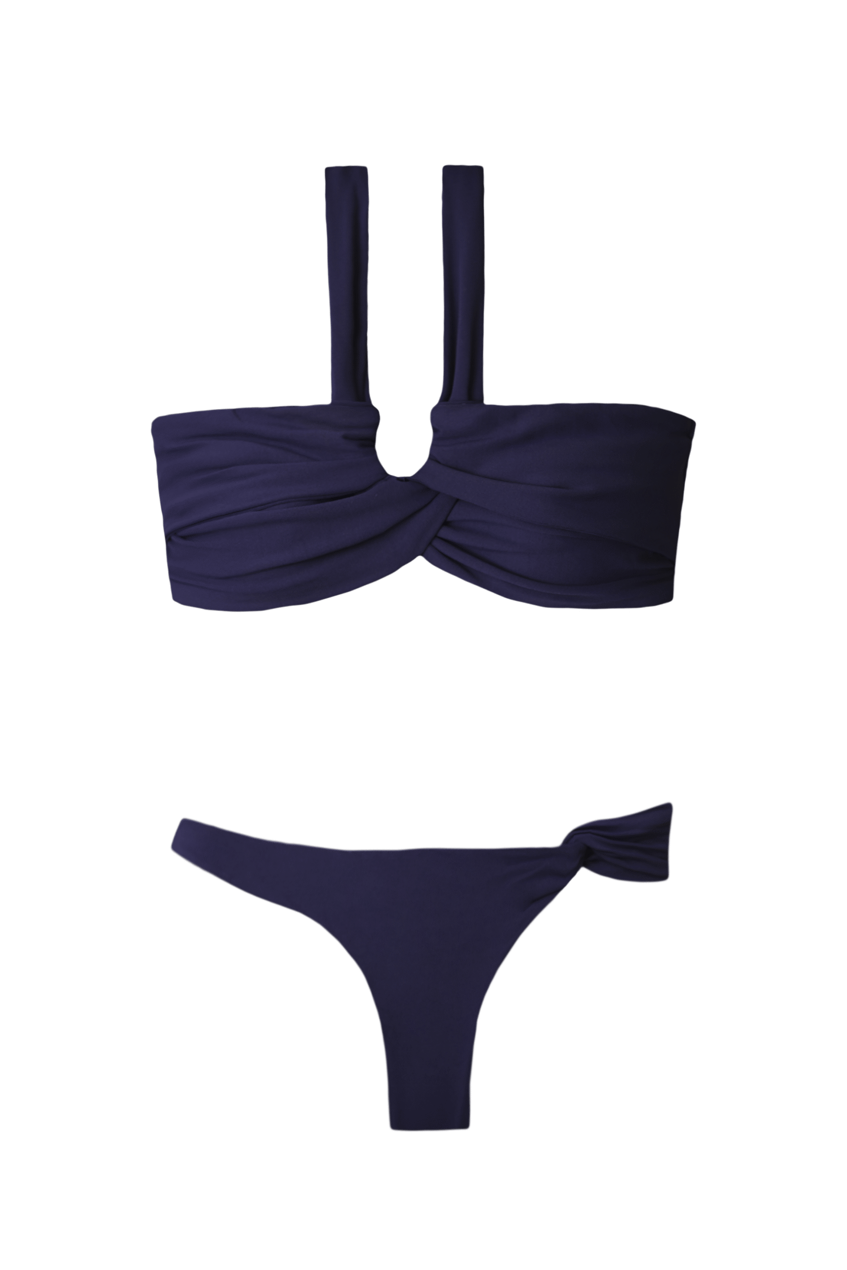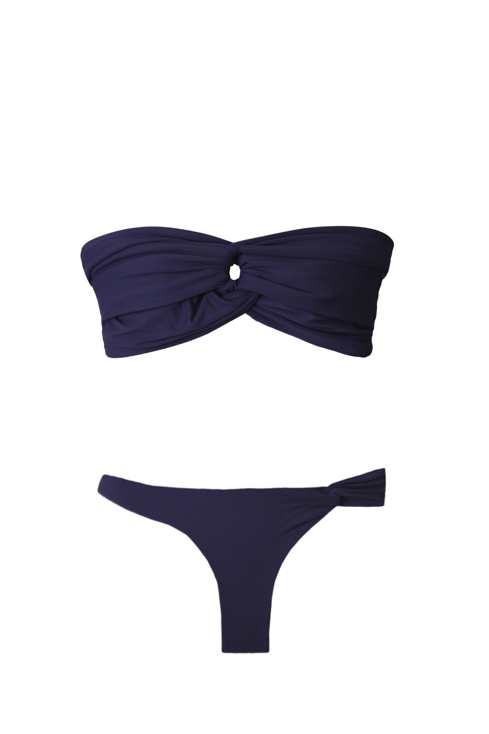 A calcinha tem a mesma proposta entrelaçada do top, dupla com as costuras embutidas, não possui elástico para não marcar (somente a elasticidade do tecido) e possui o forro do mesmo tecido.